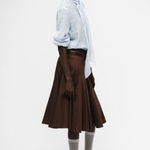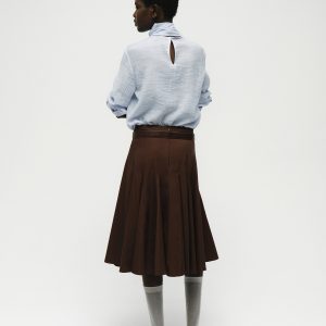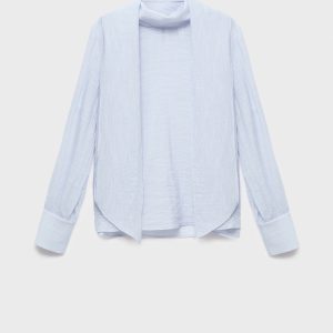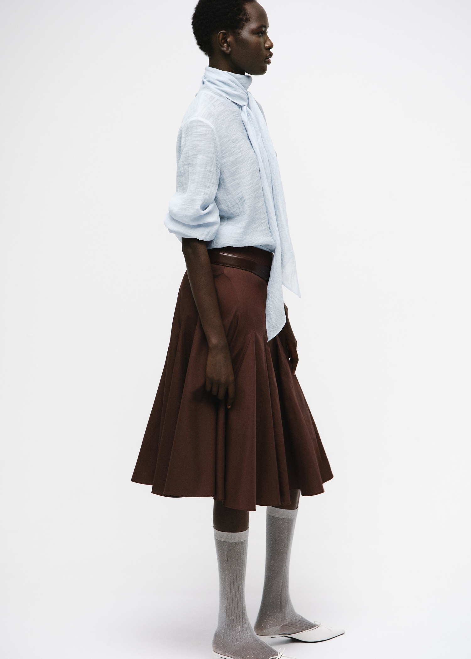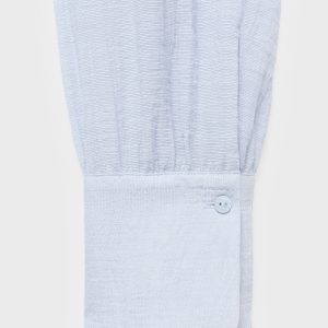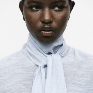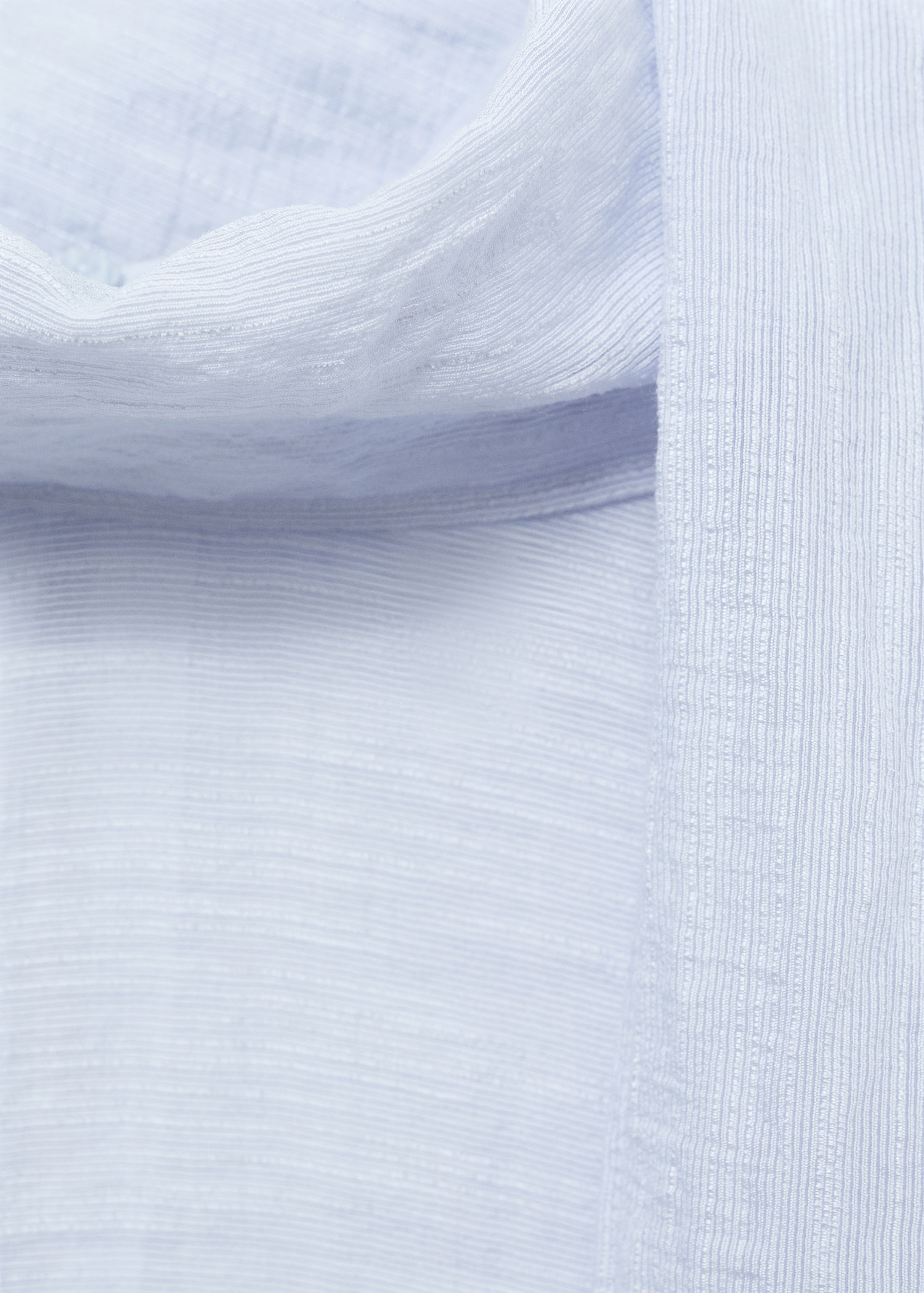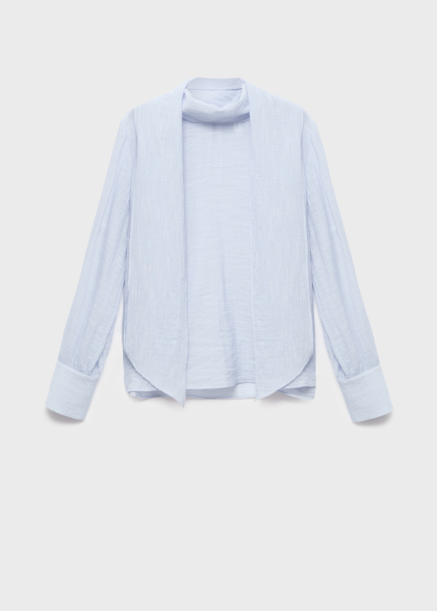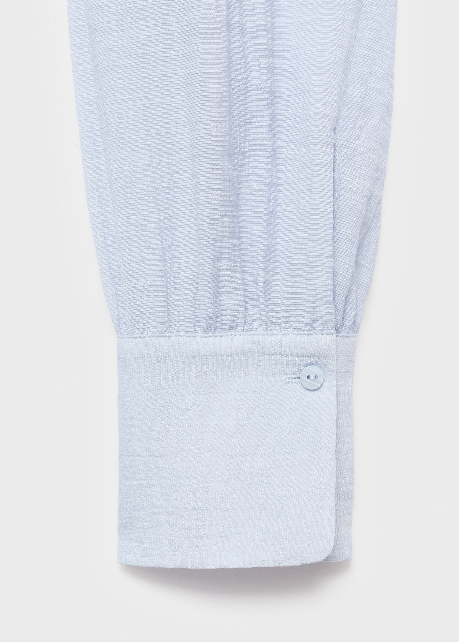 With a straight design and textured fabric, this garment features a high enveloping collar adorned with a foulard. The long sleeves have buttoned cuffs, and the button closure at the neck completes the sophisticated style.