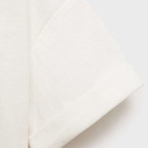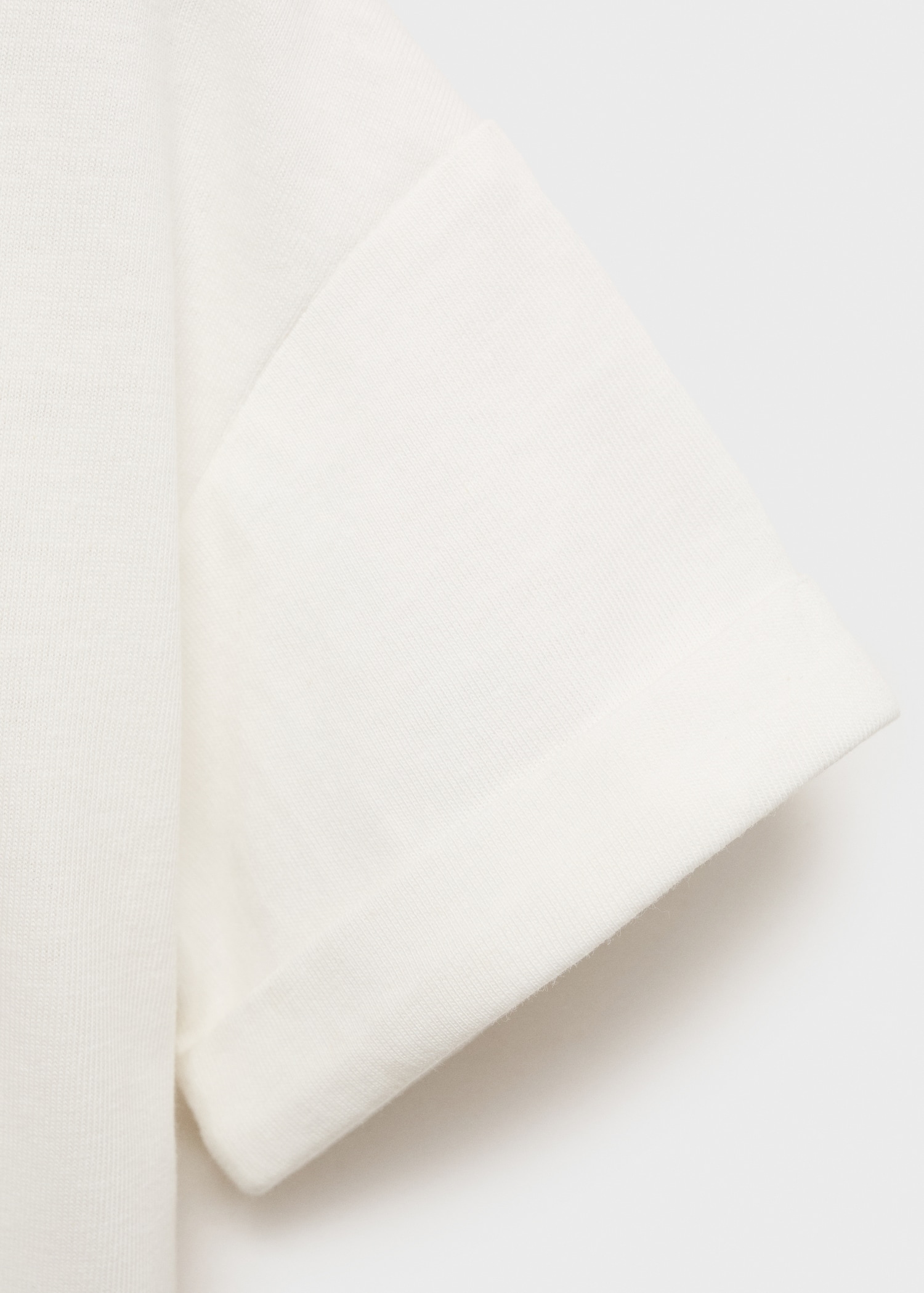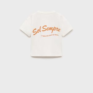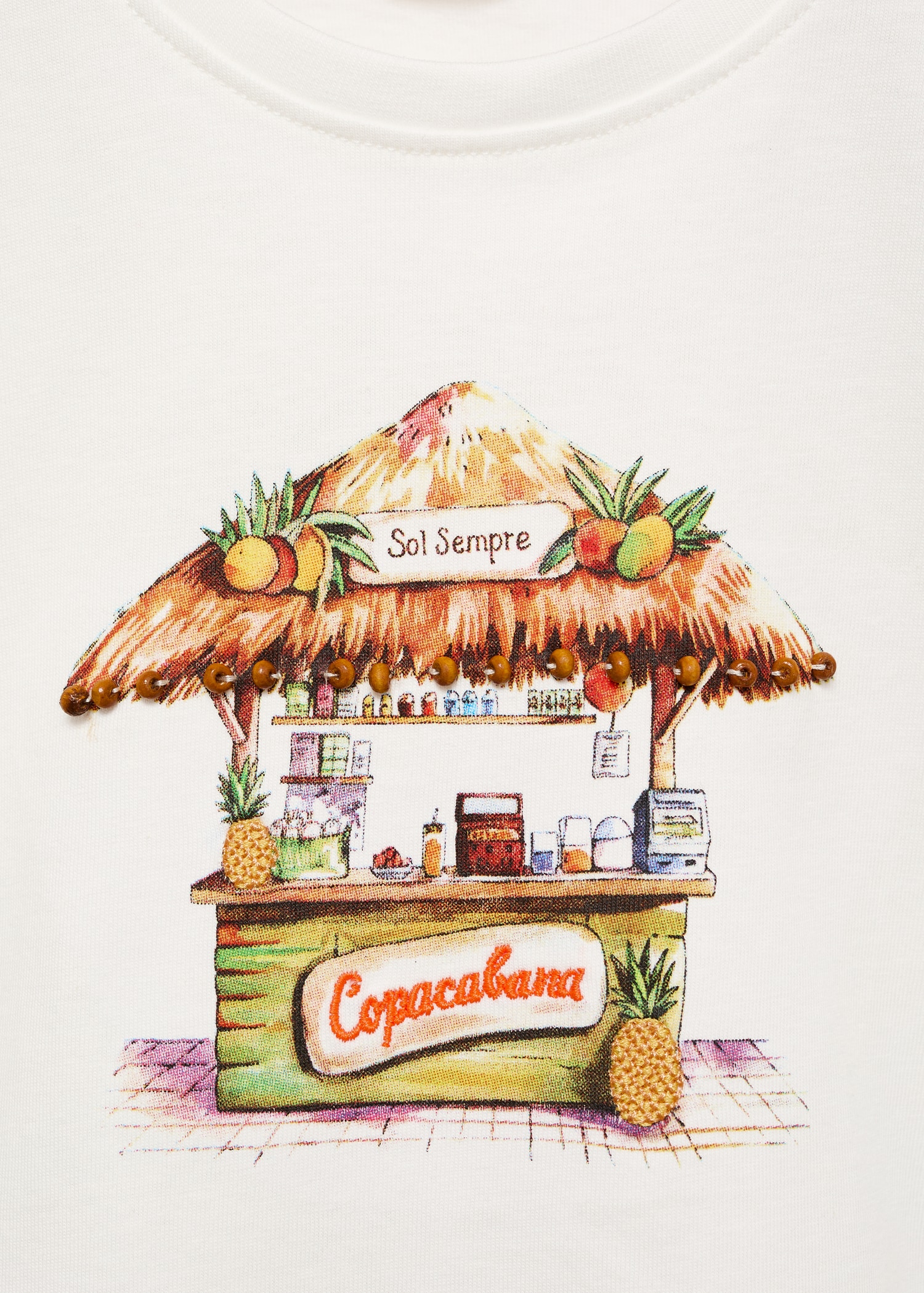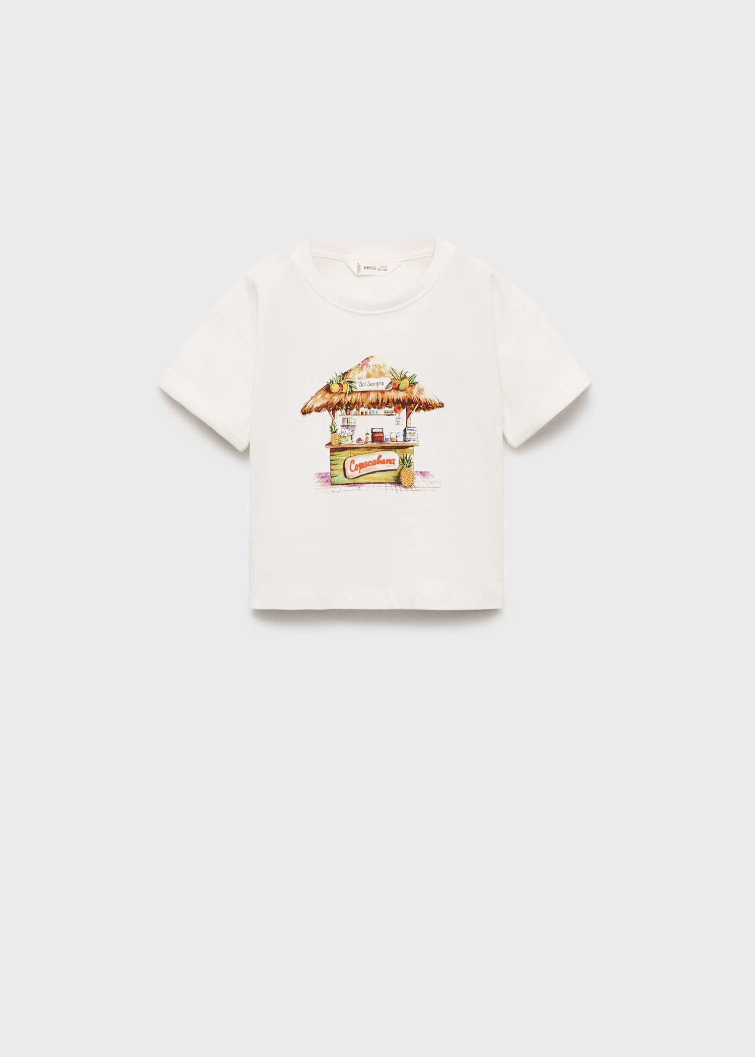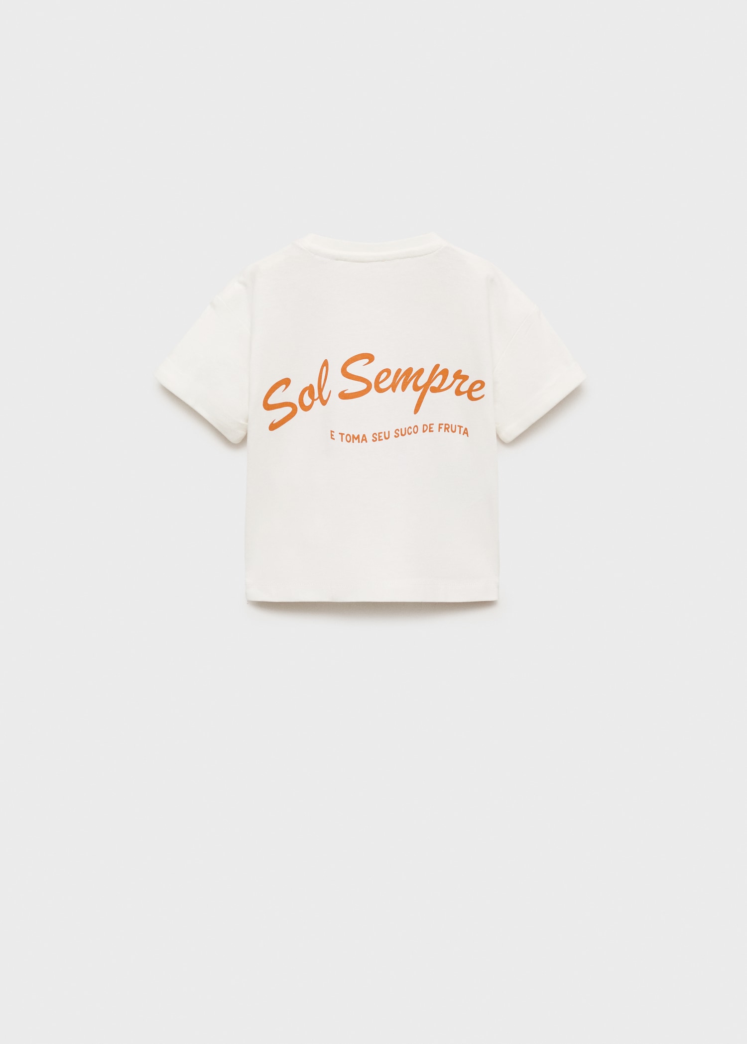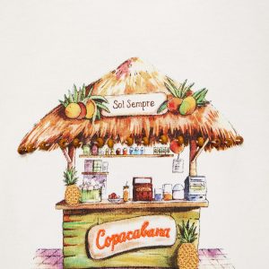 100% cotton fabric. Straight Design. Printed design. Tropical print. Crew neck. Short sleeves with turn-up cuffs. Image printed on the front. Printed message on the back