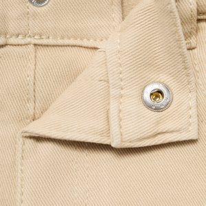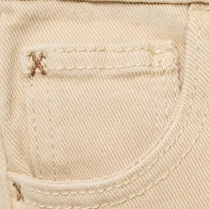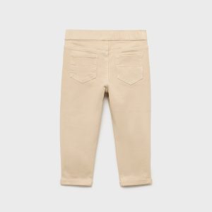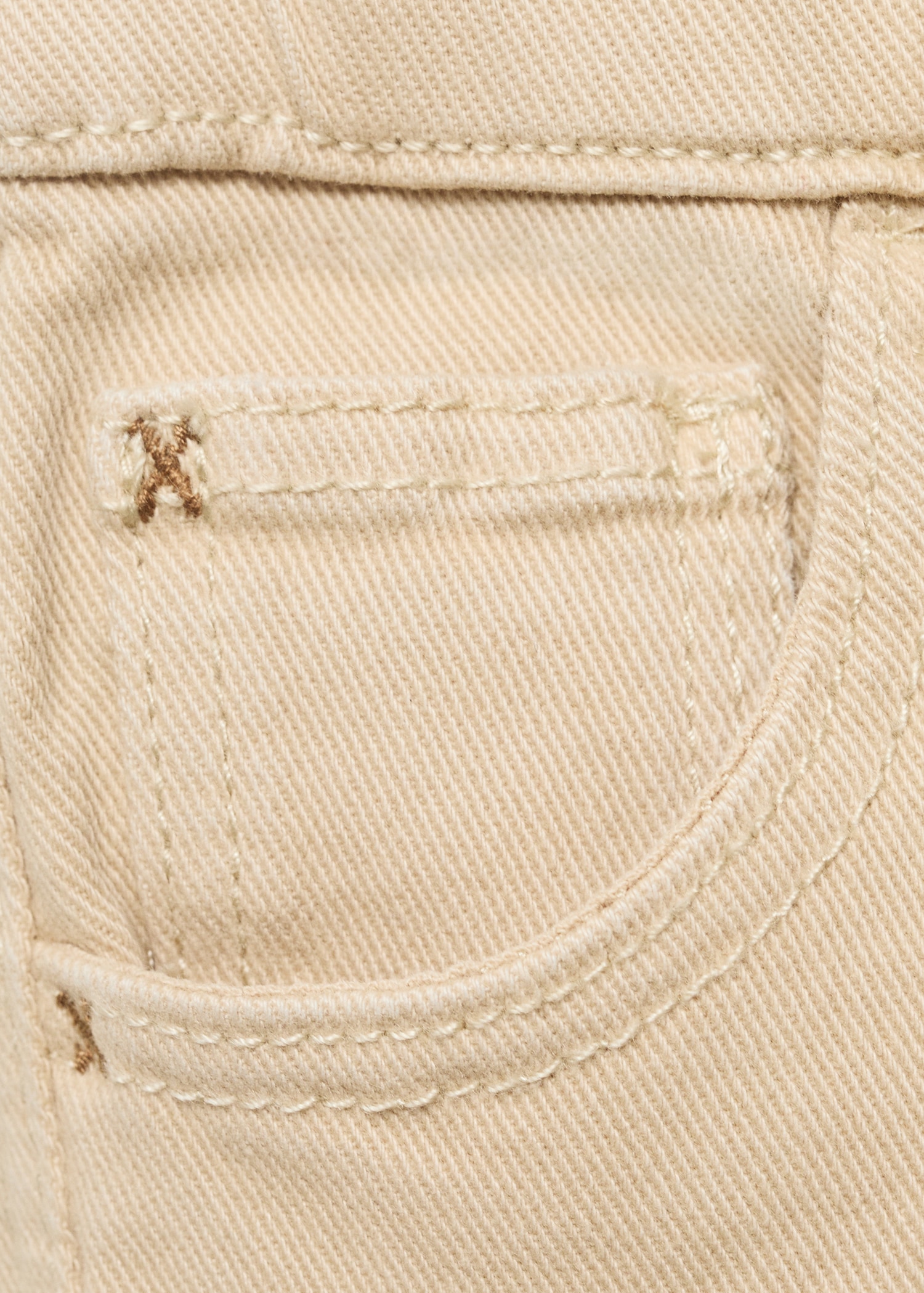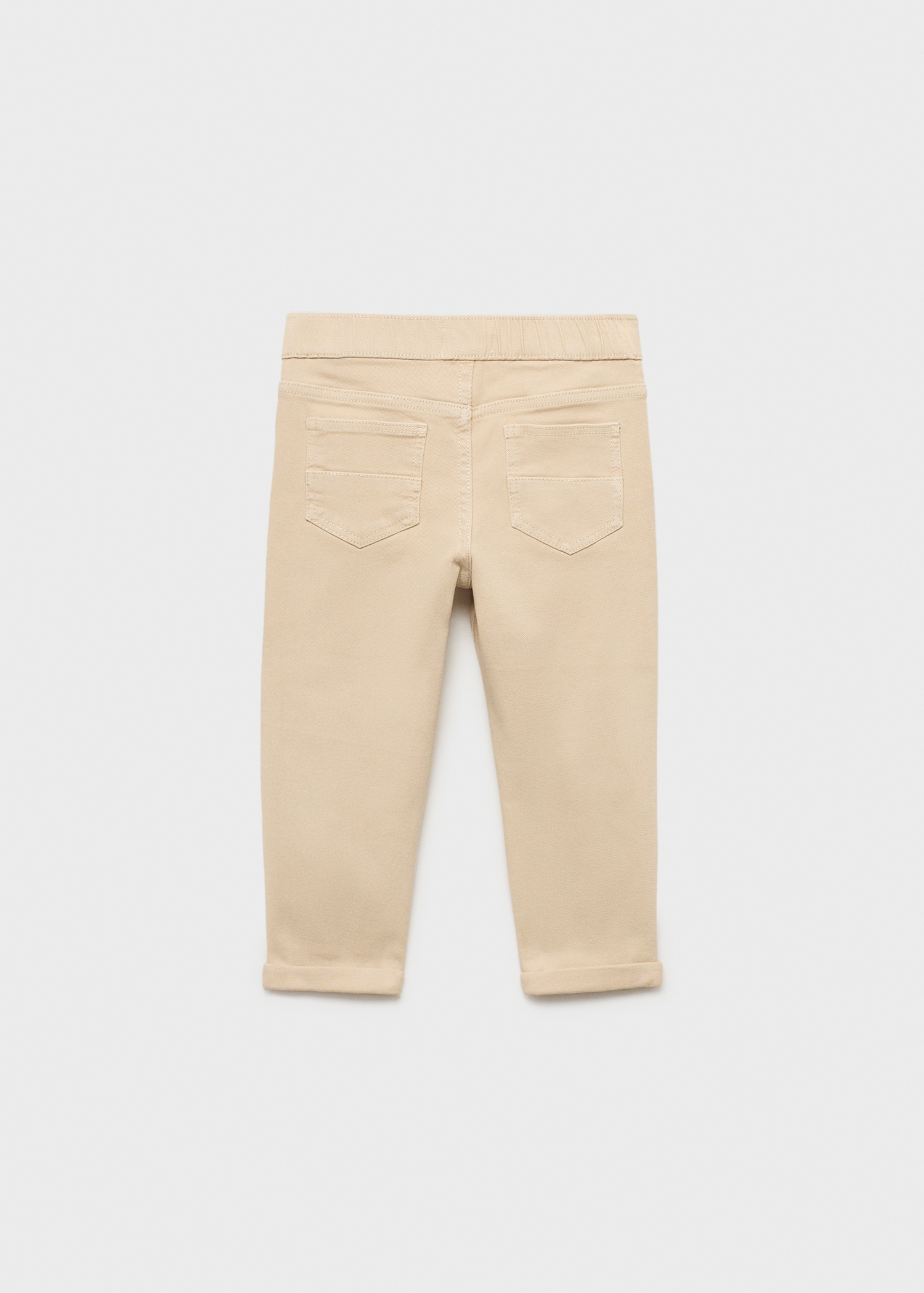 Cotton fabric. Denim fabric. Stretch fabric. Long design. Embroidered cross detail on the pockets. Belt loops. Elastic waist. One press stud fastening. Two side pockets. Rolled-up hem. Back to school