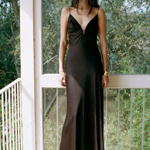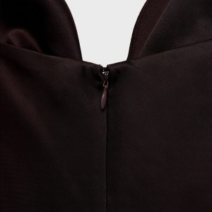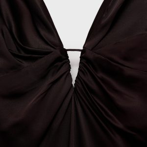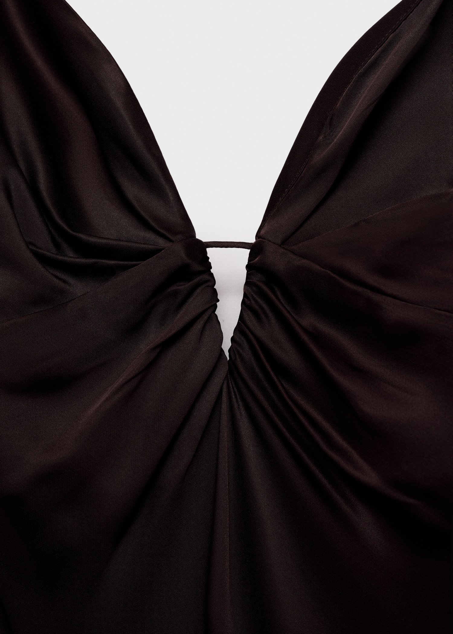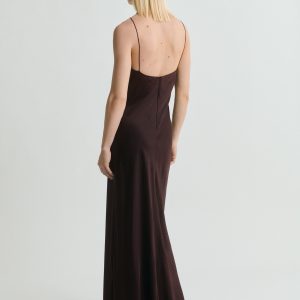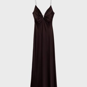 Satin weave. Long design. Straight Design. V-neck. Runched detail in the neckline. Sleeveless. Thin straps. Back zipper closure. This garment is part of our event collection, designed to make you the perfect guest at any party, wedding, or ceremony.