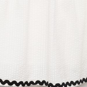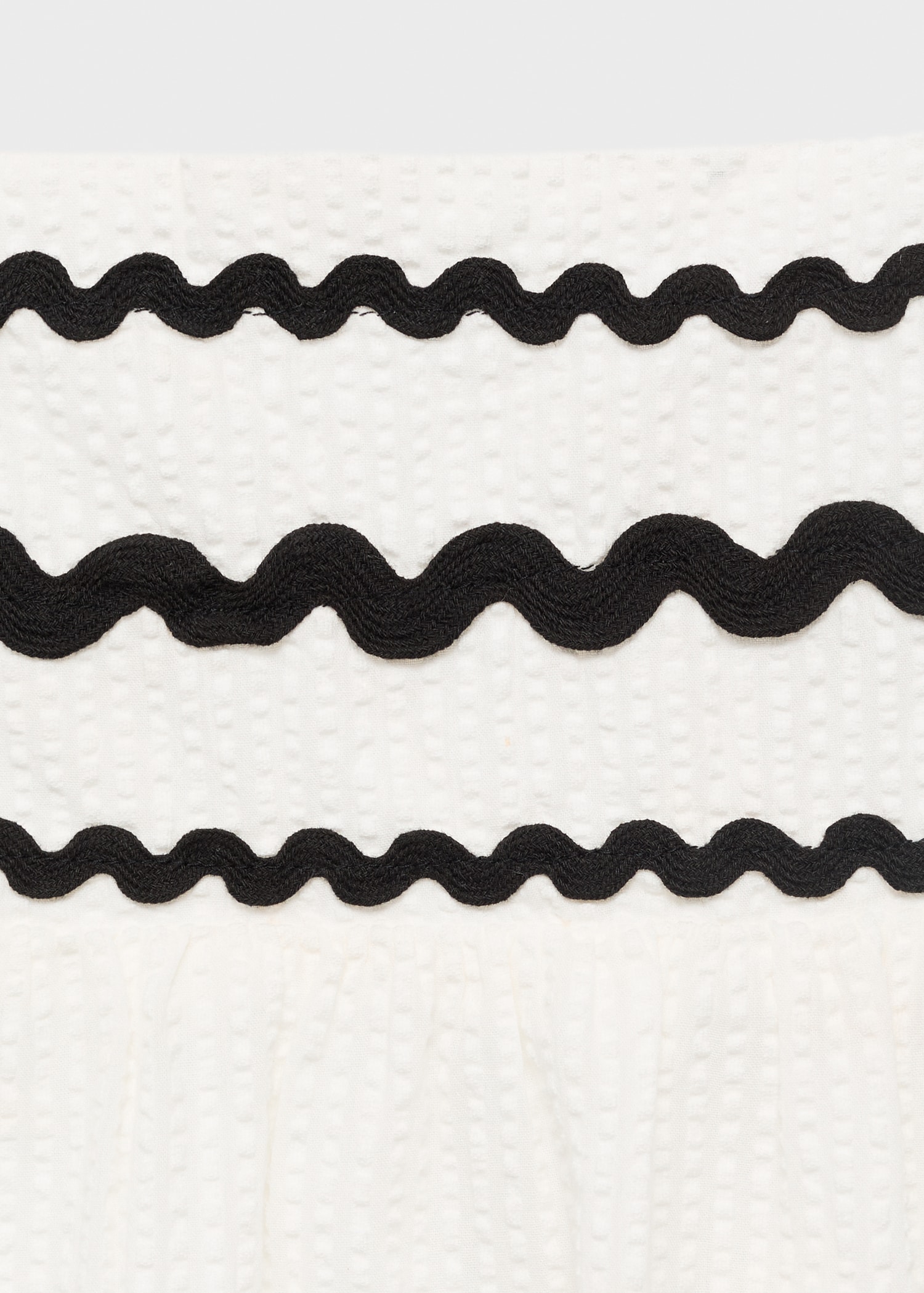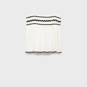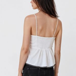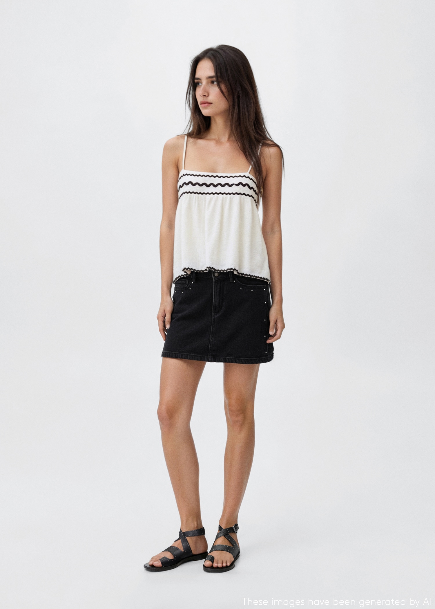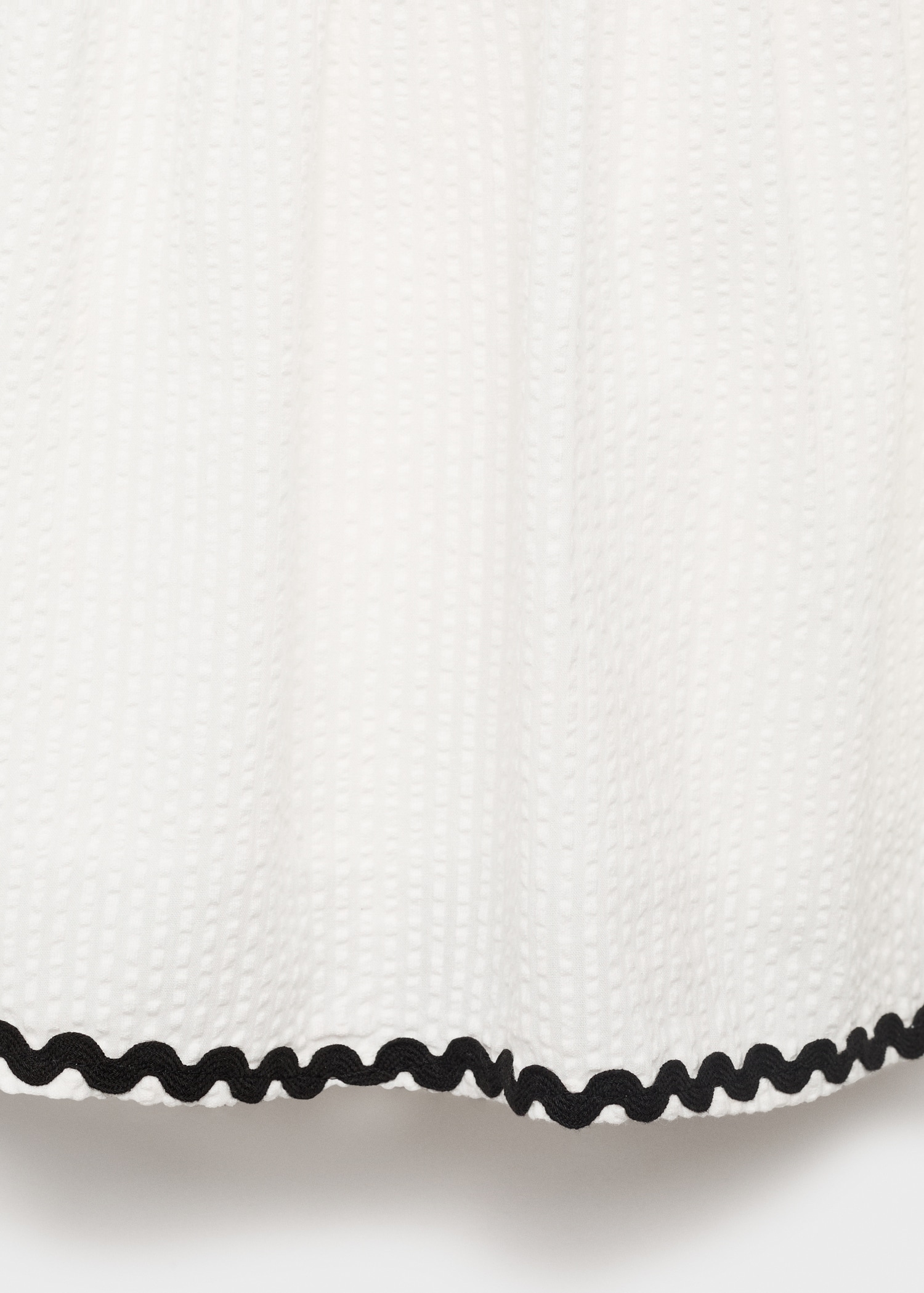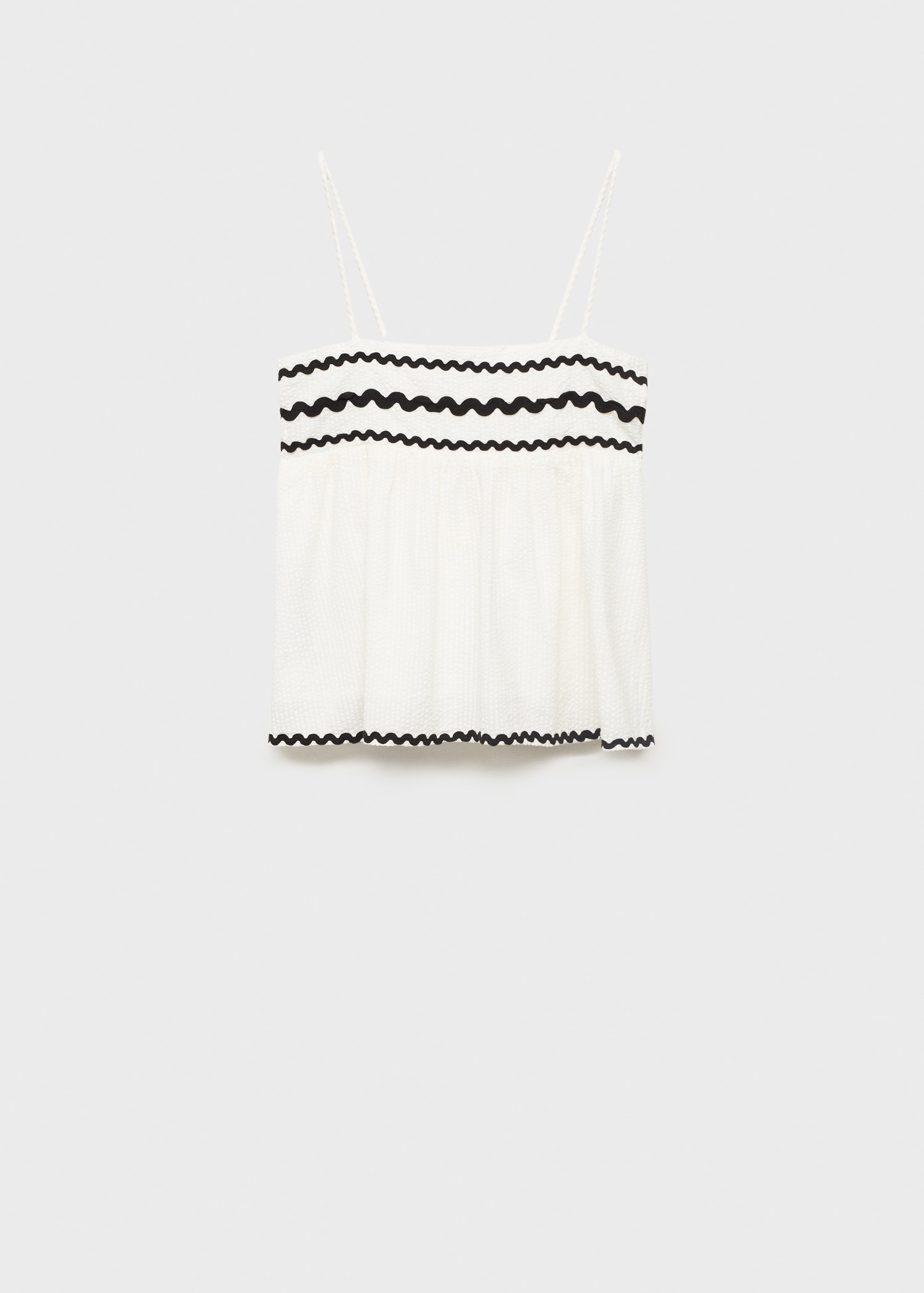 100% cotton fabric. Textured fabric. A-line design. Straight neck. Thin straps. Embroidered border on the chest. Back with elastic ruched detail. With inner lining