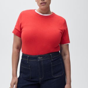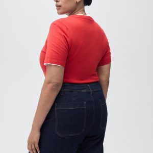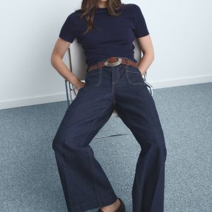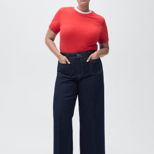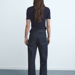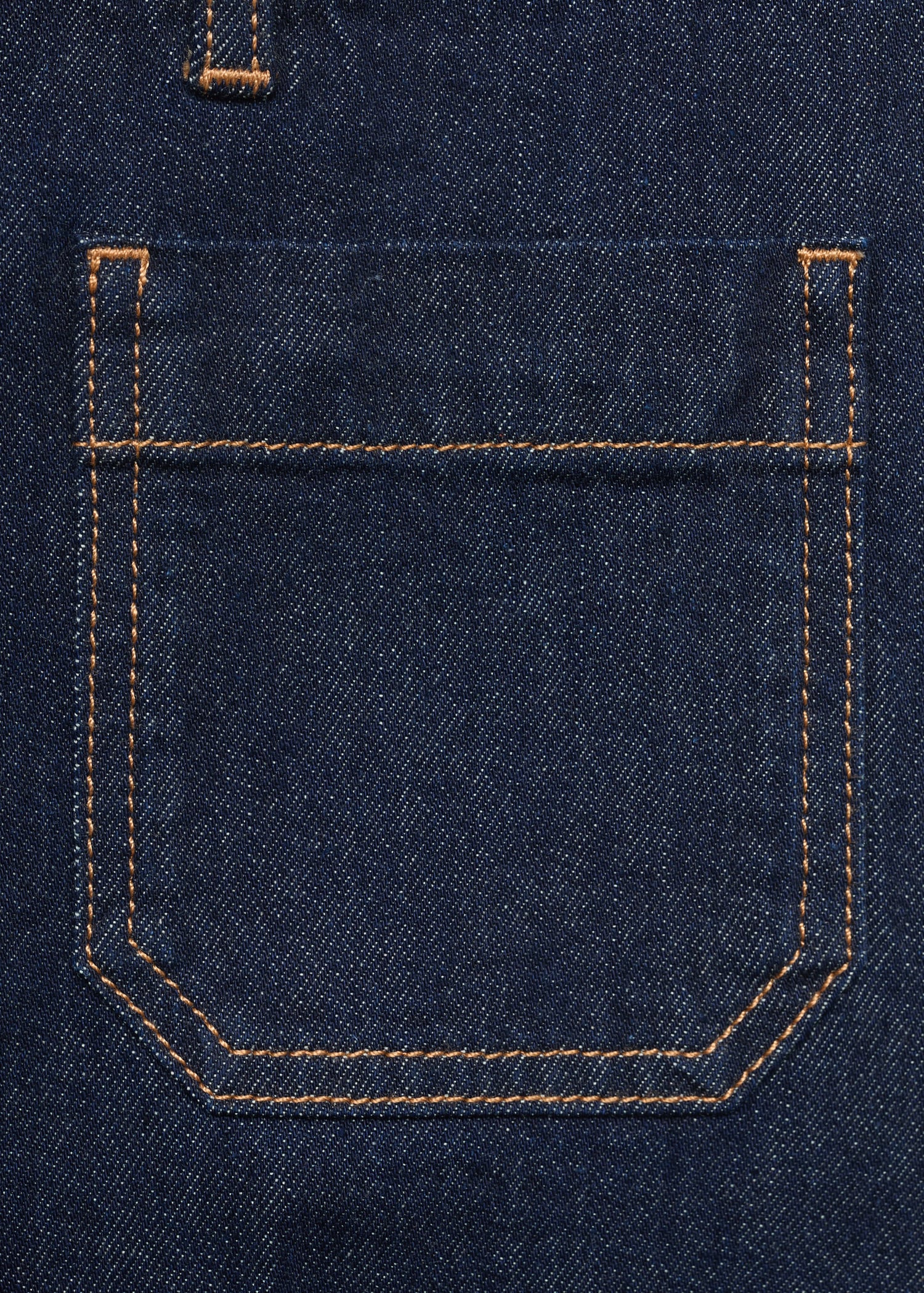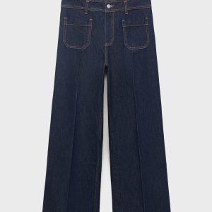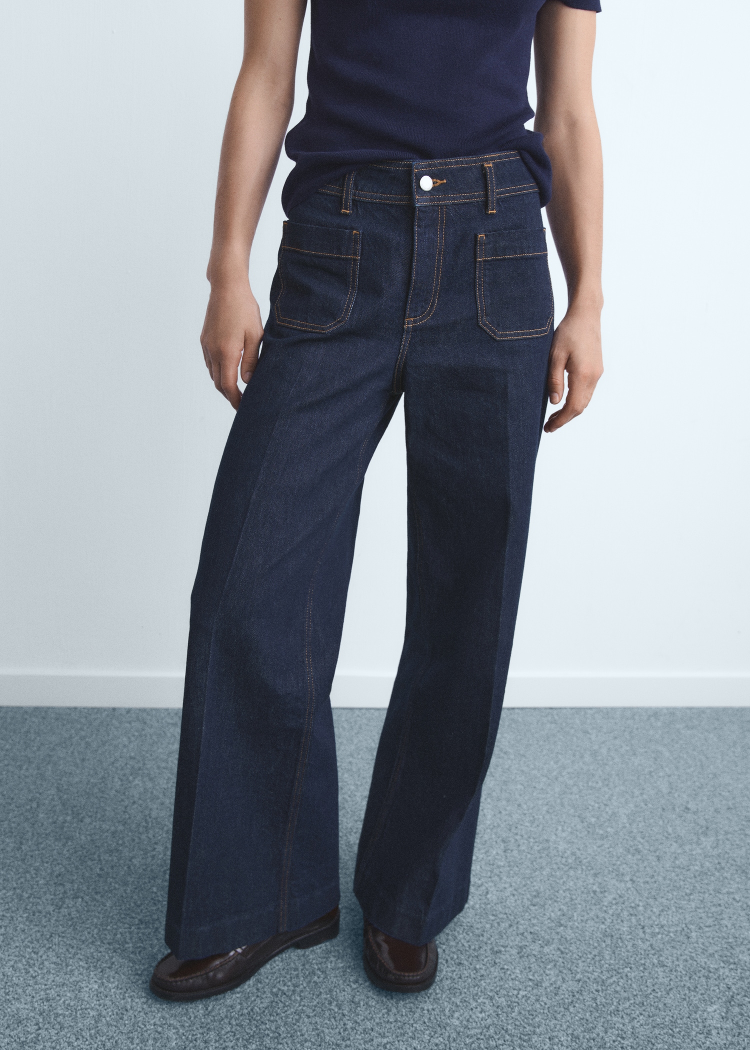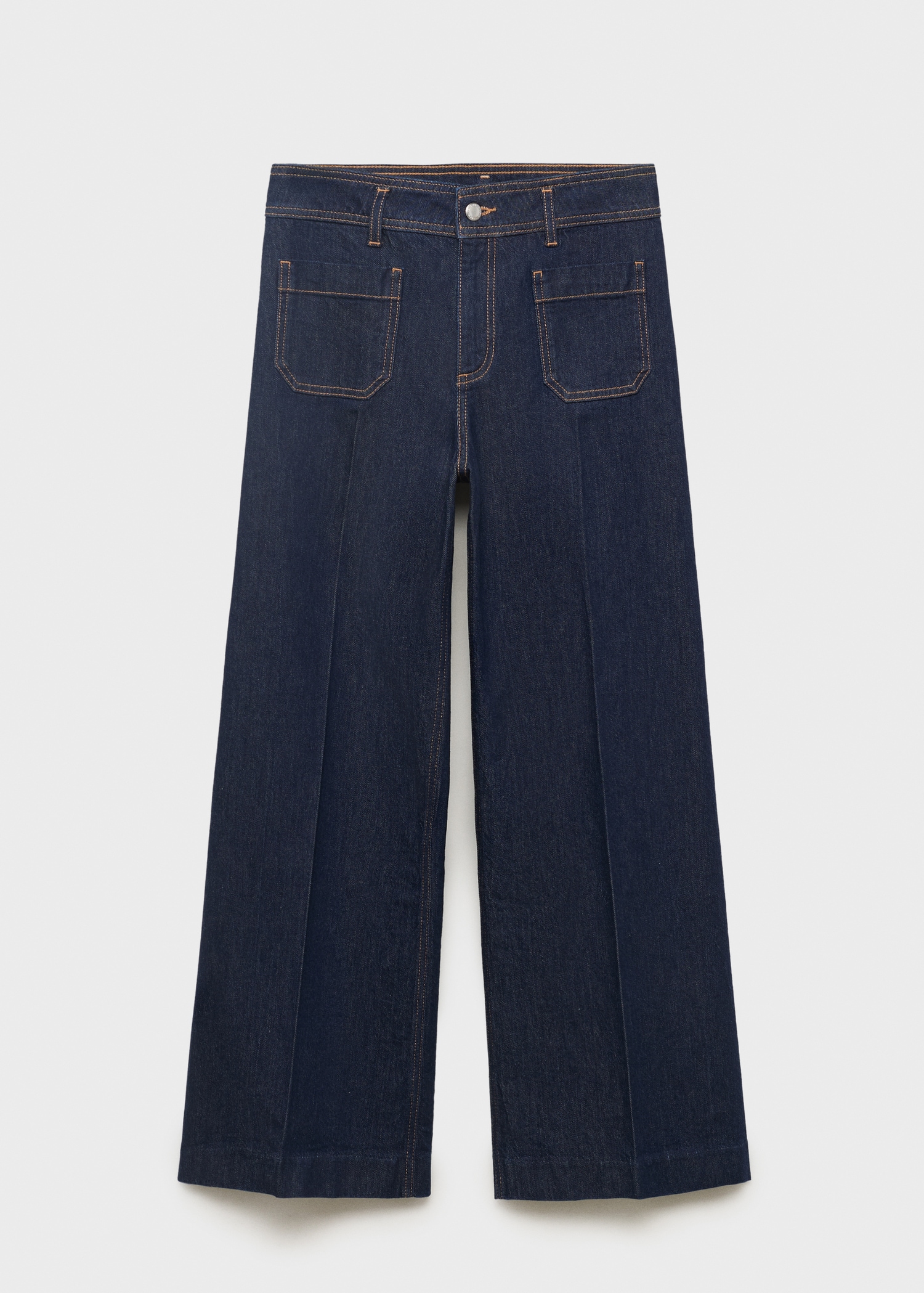 Cotton denim fabric. Long design. Wide-leg design. High-rise. Belt loops. Two patch pockets on the front. Front zipper and button closure. Inner length 74.5 cm. Available Plus. Comfort fabric with elasticity