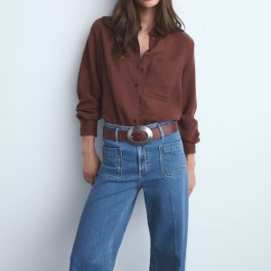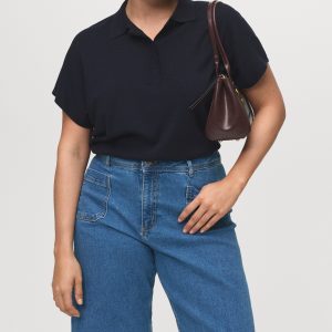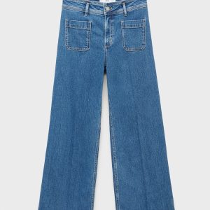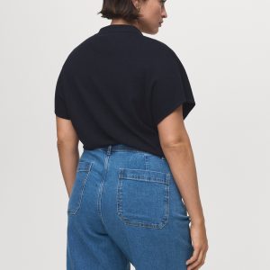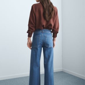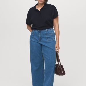 Cotton denim fabric. Long design. Wide-leg design. High-rise. Belt loops. Two patch pockets on the front. Front zipper and button closure. Available Plus