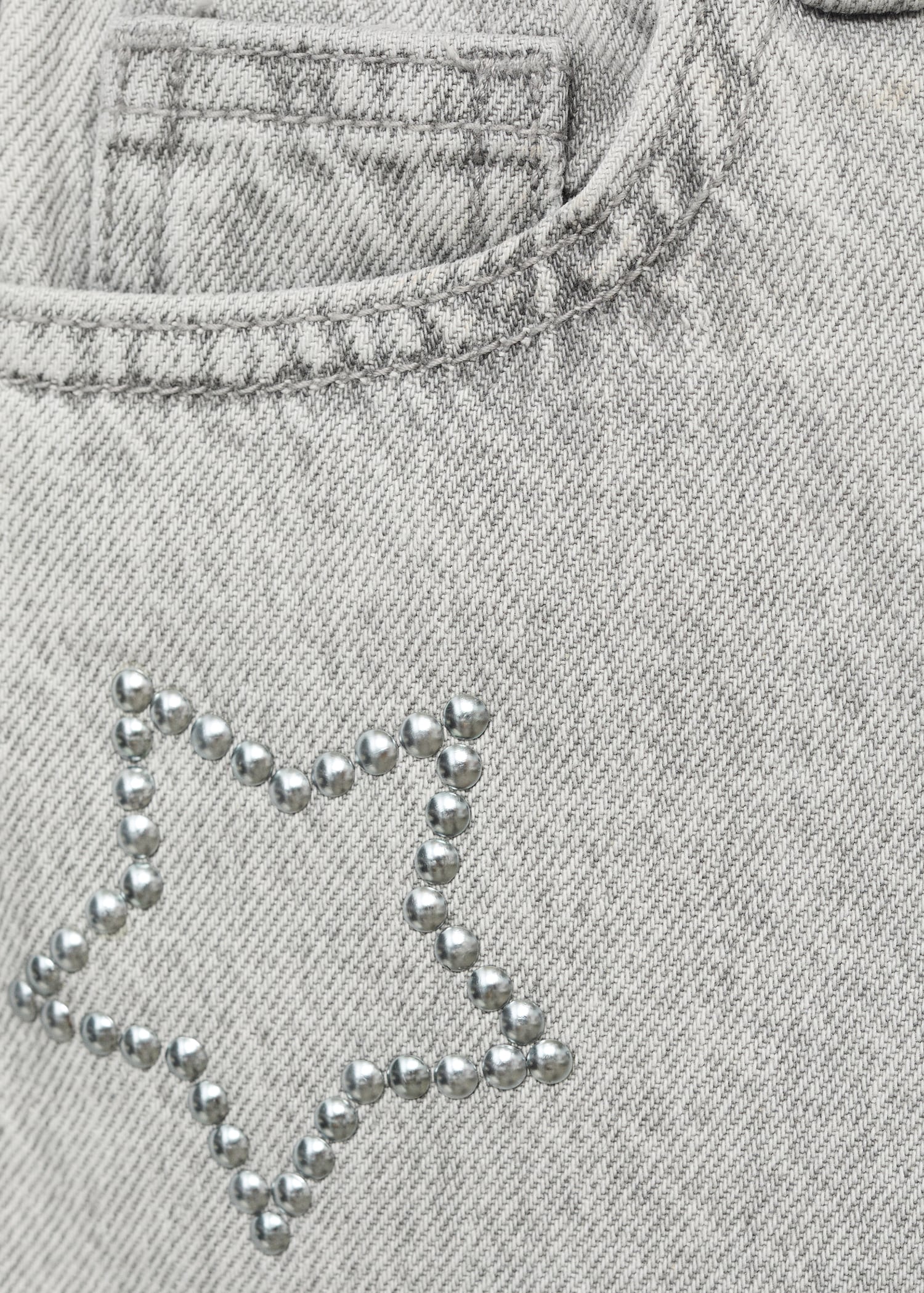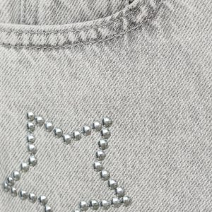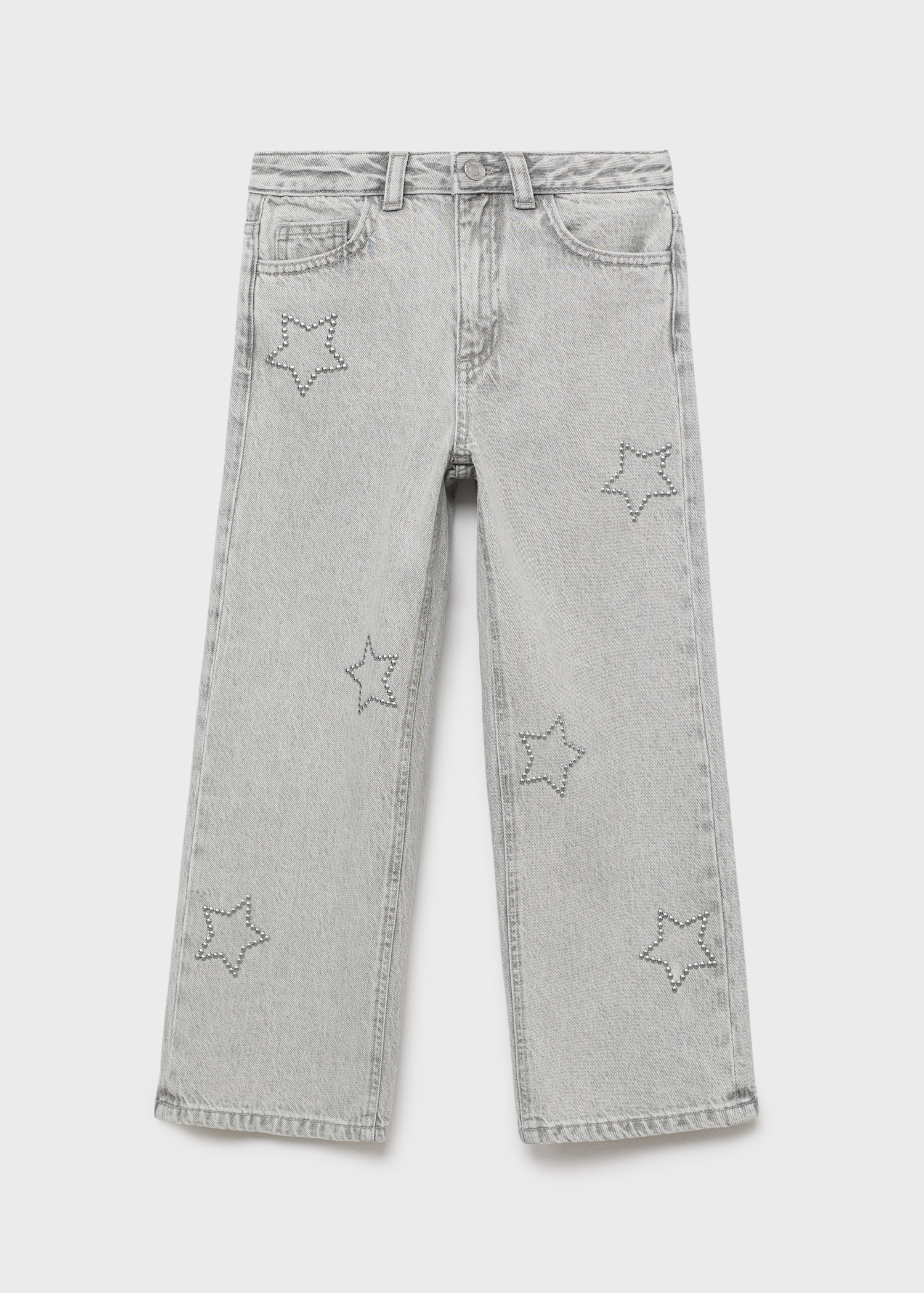 100% cotton fabric. Long design. Wide-leg design. Star design. Decorative studs. Belt loops. Button and zipper closure. Two side pockets. Two patch pockets at the back