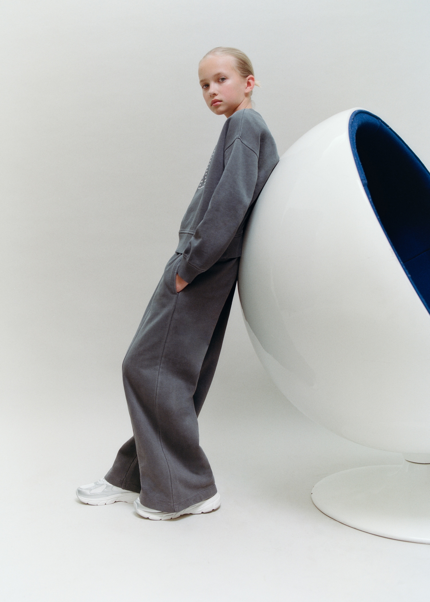 100% cotton fabric. Wide-leg design. Jogger style. Elastic waist. Stitching detail. Two side pockets. Total look