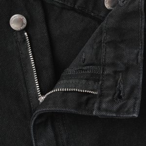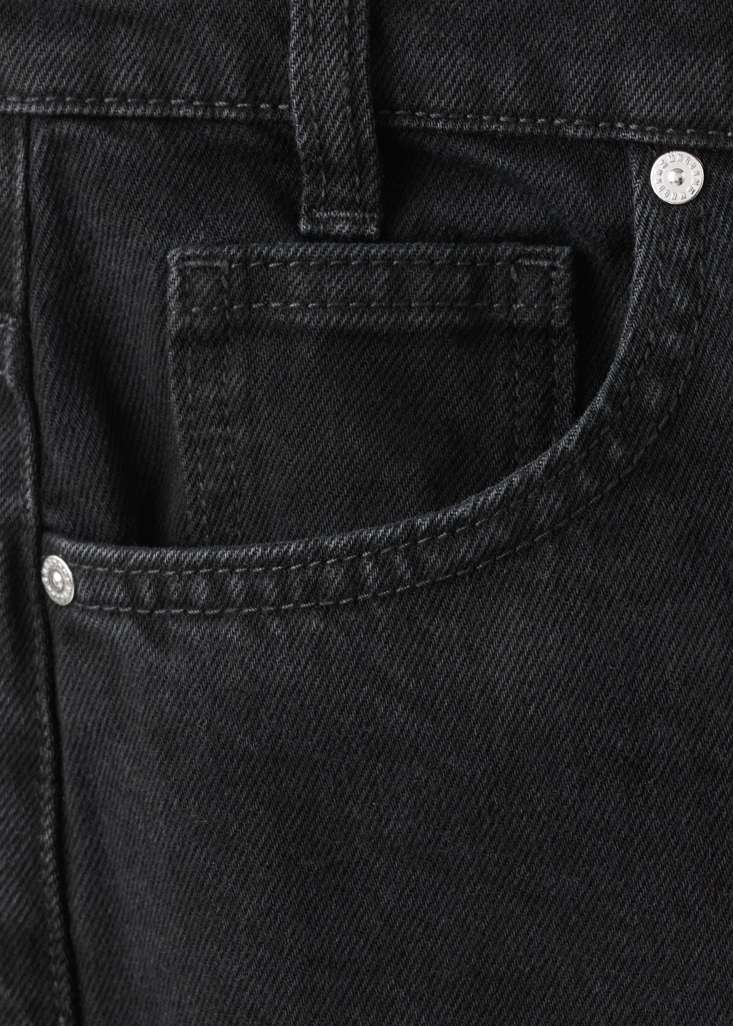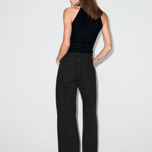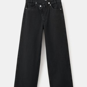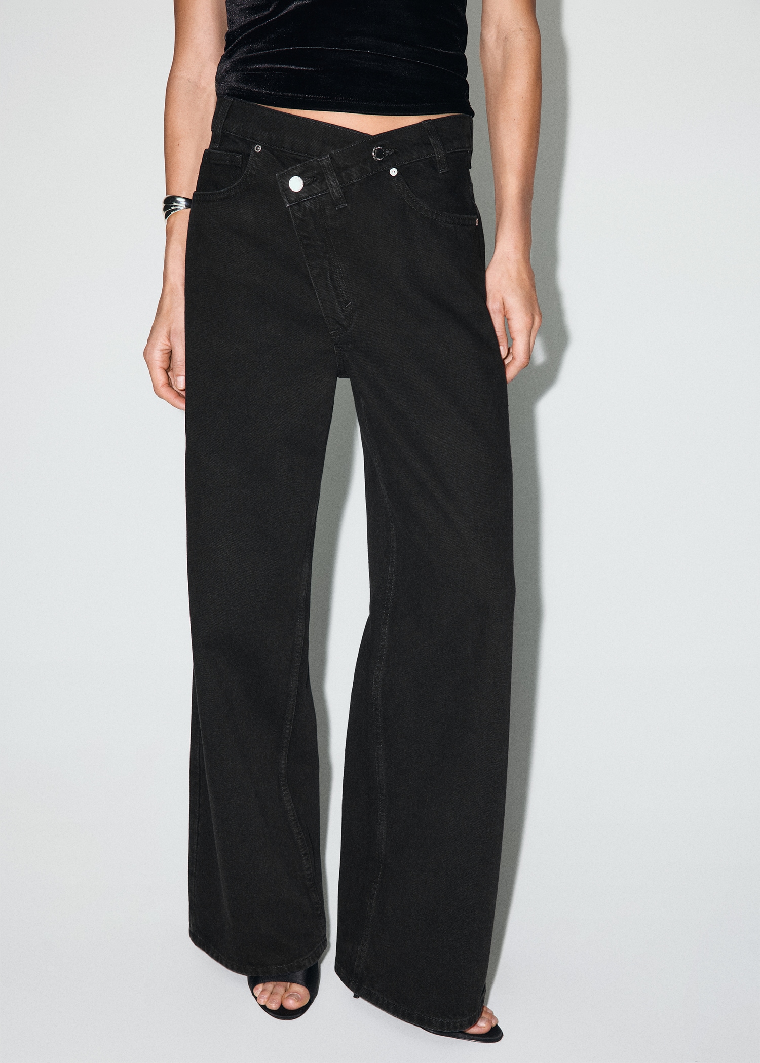 Cotton denim fabric. Long design. Wide leg design. Mid-rise. Wrap belt. Belt loops. Five pockets. Asymmetrical front closure with zip and buttons