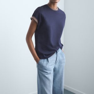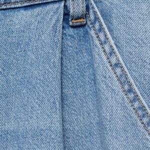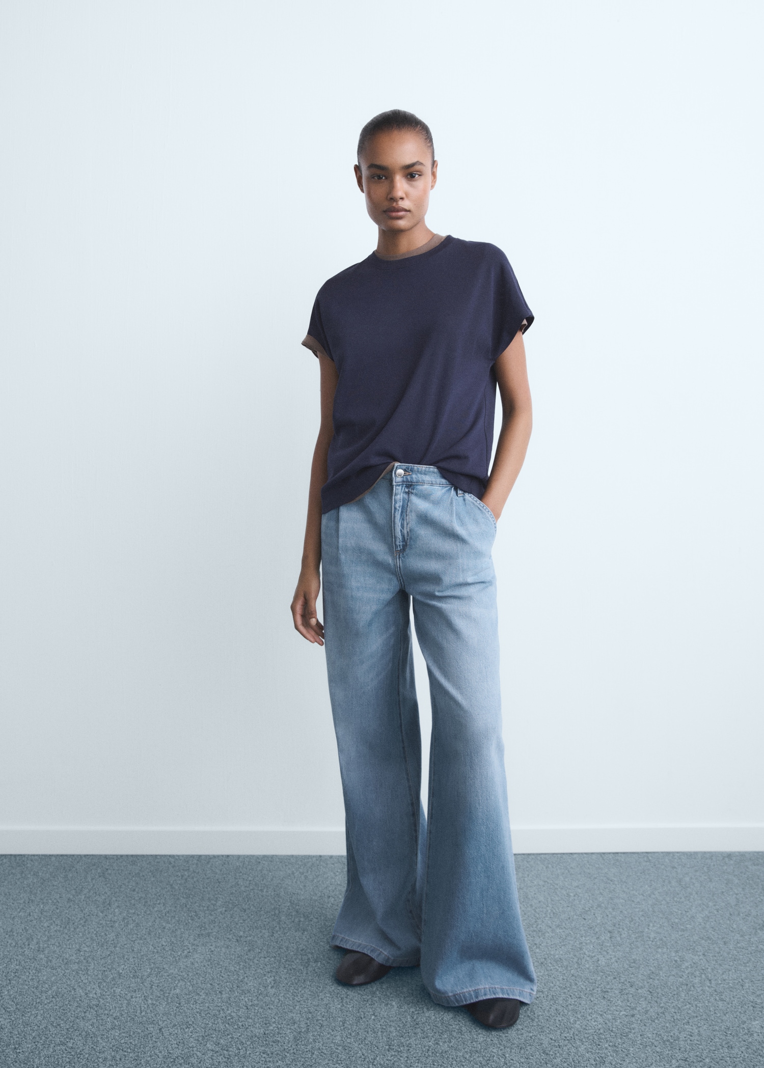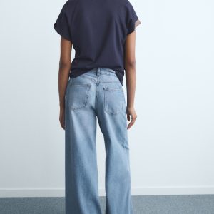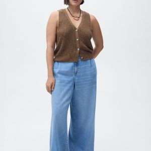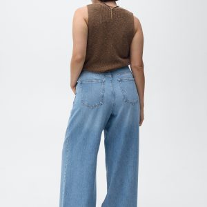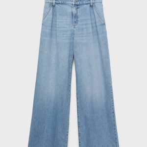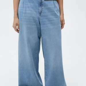 Cotton denim fabric. Long design. Wide-leg design. Mid-rise. Belt loops. Front pleat detail. Jeans with tie closure. Button and zipper closure. Inseam length 81 cm. Available Plus