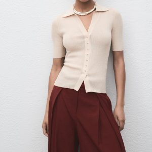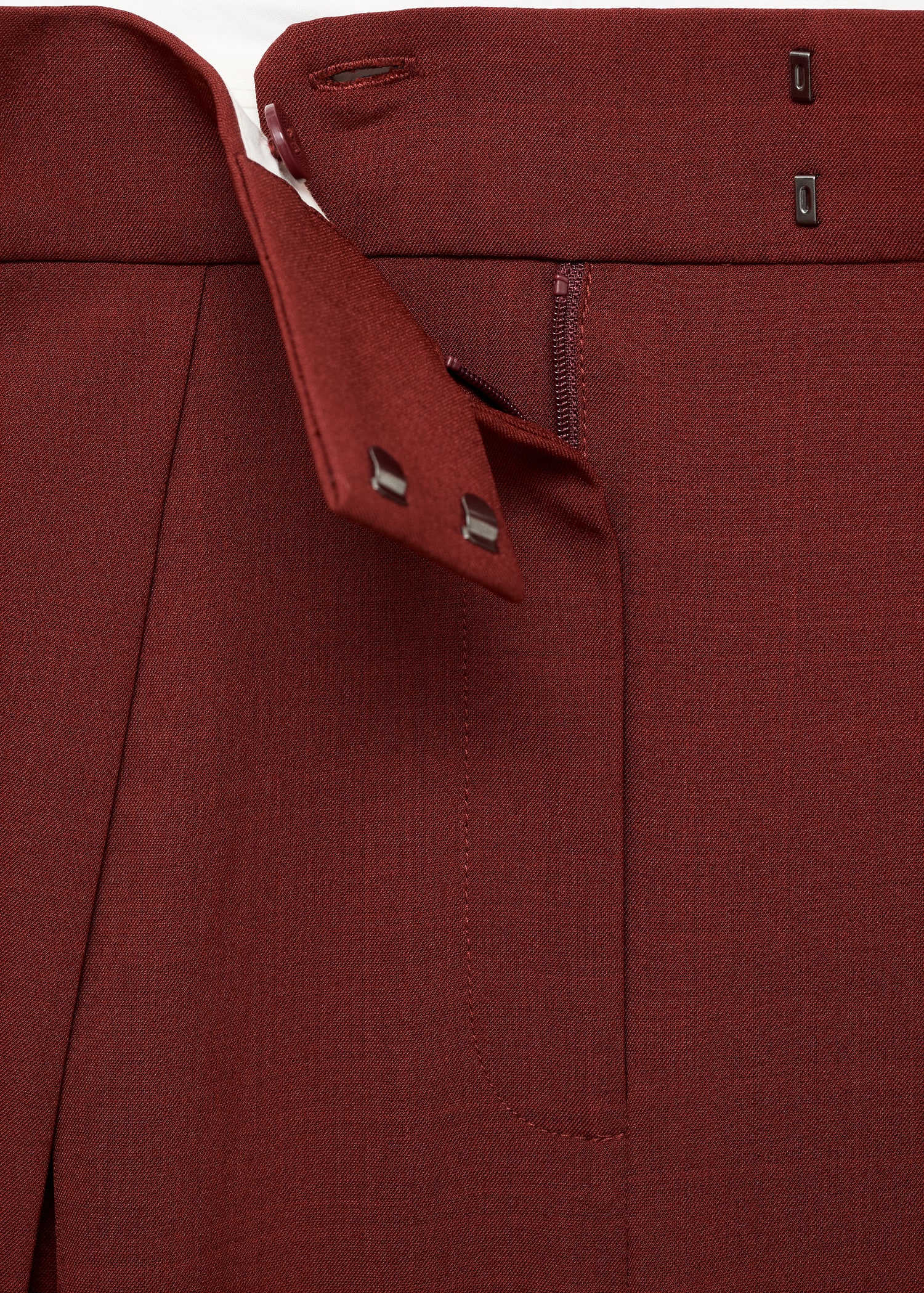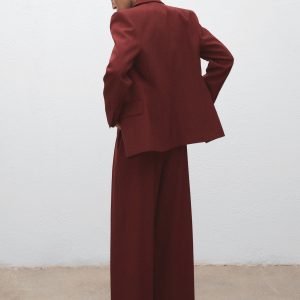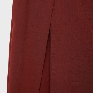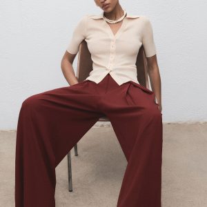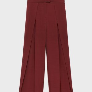 Long design. Wide leg design. Mid-rise. Two side pockets. Front pleat detail. Zipper, button and concealed hook-and-loop fastener with placket. Inner lining. Total look