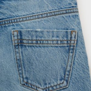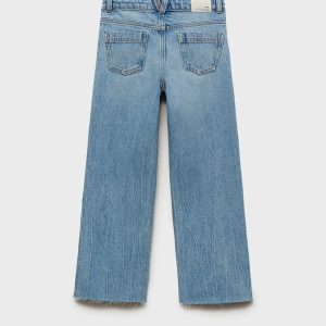 100% cotton fabric. Cotton denim fabric. Wide-leg design. Regular Waist Rise. Long design. Belt loops. Coin pocket. Two side pockets. Two patch pockets at the back. Frayed hem
