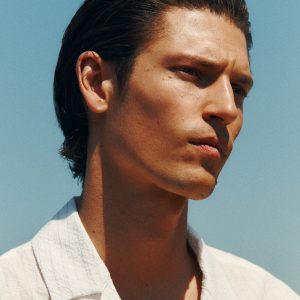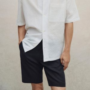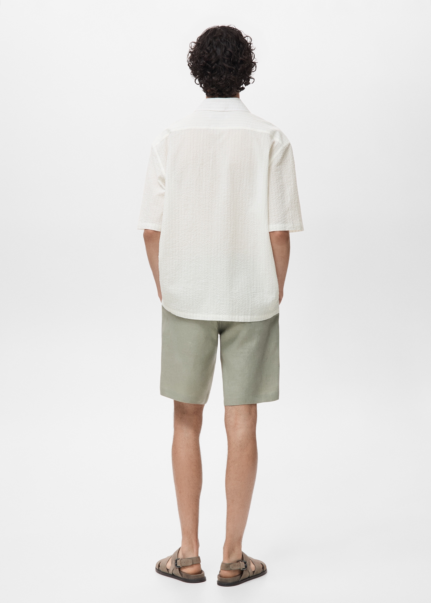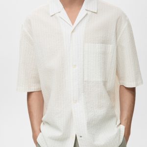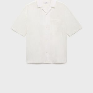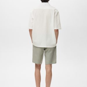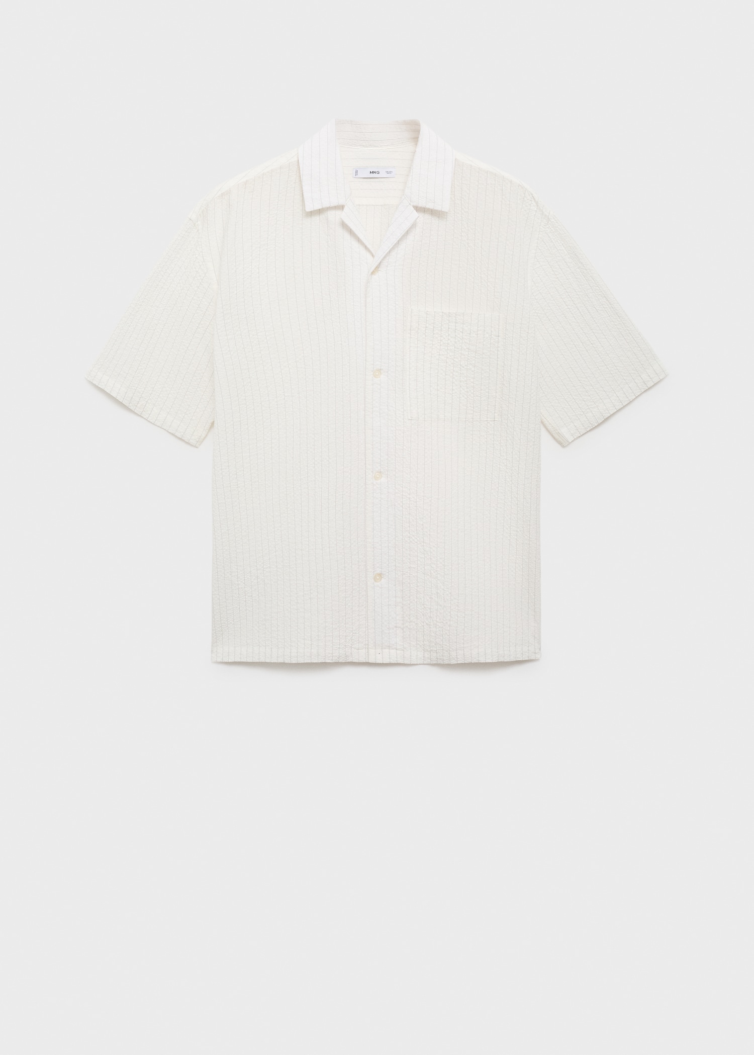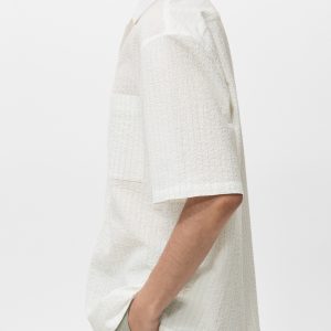 Regular Silhouette. Cotton fabric. Print Diplomatic line. Bowling collar. Short sleeve. Patch pocket on the chest. Front button closure. Straight hem. Small side slits at the hem